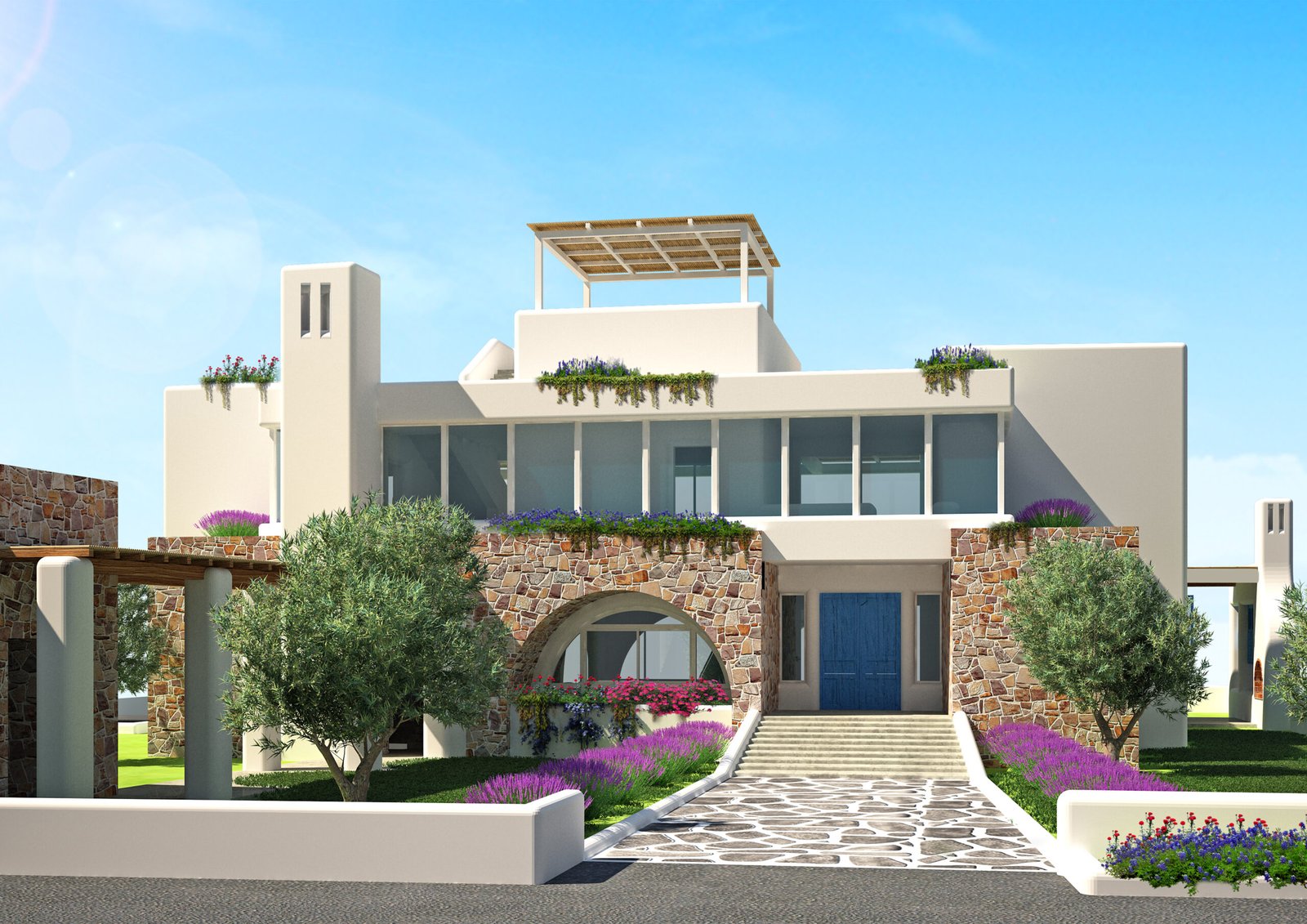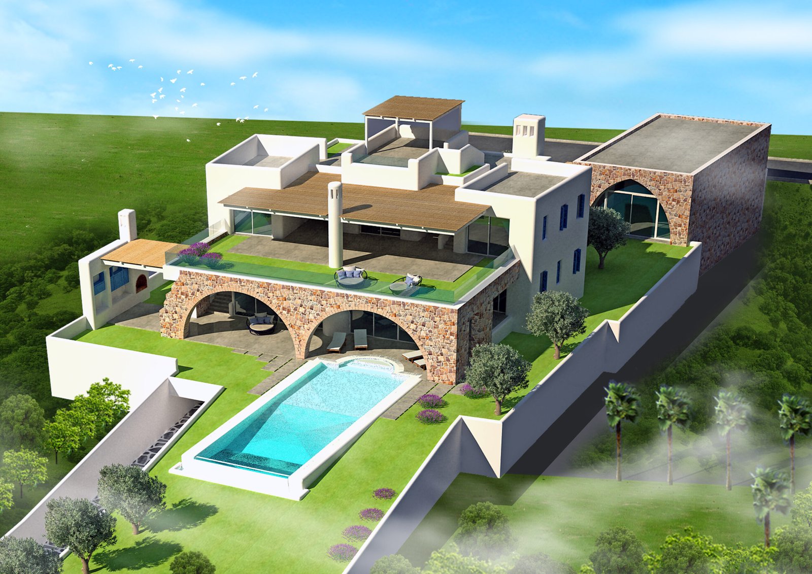 This design blends traditional Lebanese and modern elements, featuring classic stone arches on the ground floor that evoke heritage and strength. Above, clean lines, flat roofs, and large glass panels introduce a contemporary touch. Natural stone, white facades, and green rooftops create a harmonious fusion of tradition and modernity.