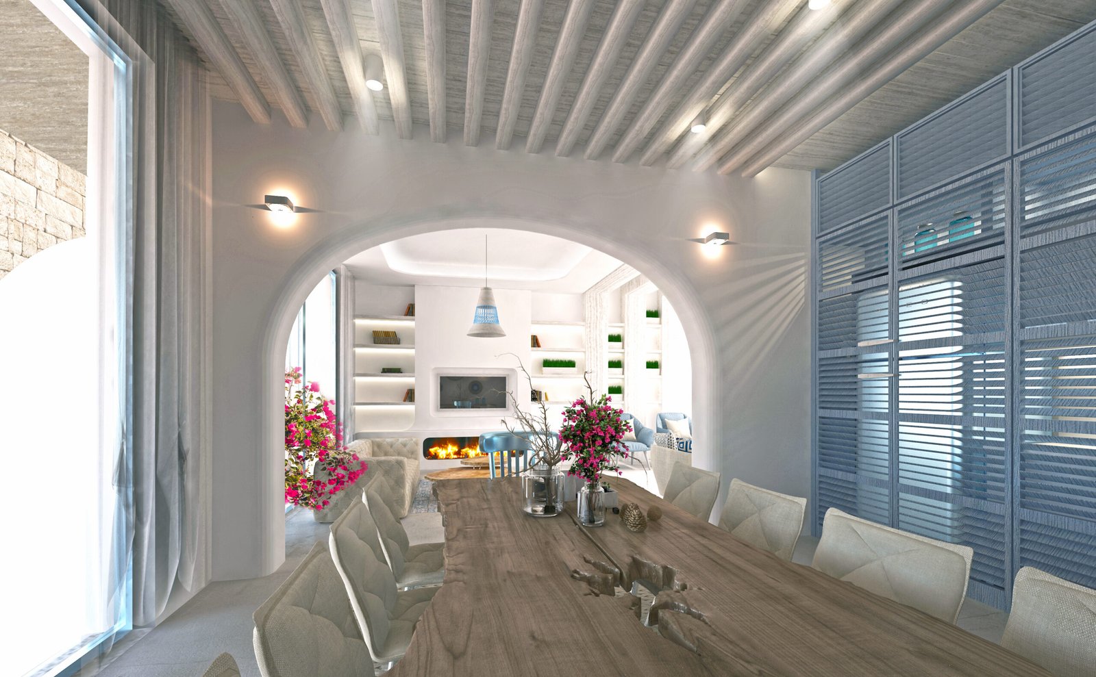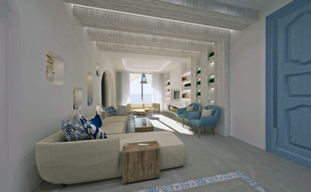 This Greek-style interior features a spacious design with a large arch separating the kitchen and living area, reminiscent of traditional Greek architecture. A classic blue and white palette evokes a Mediterranean feel, while clean lines and minimalist décor complete the look.