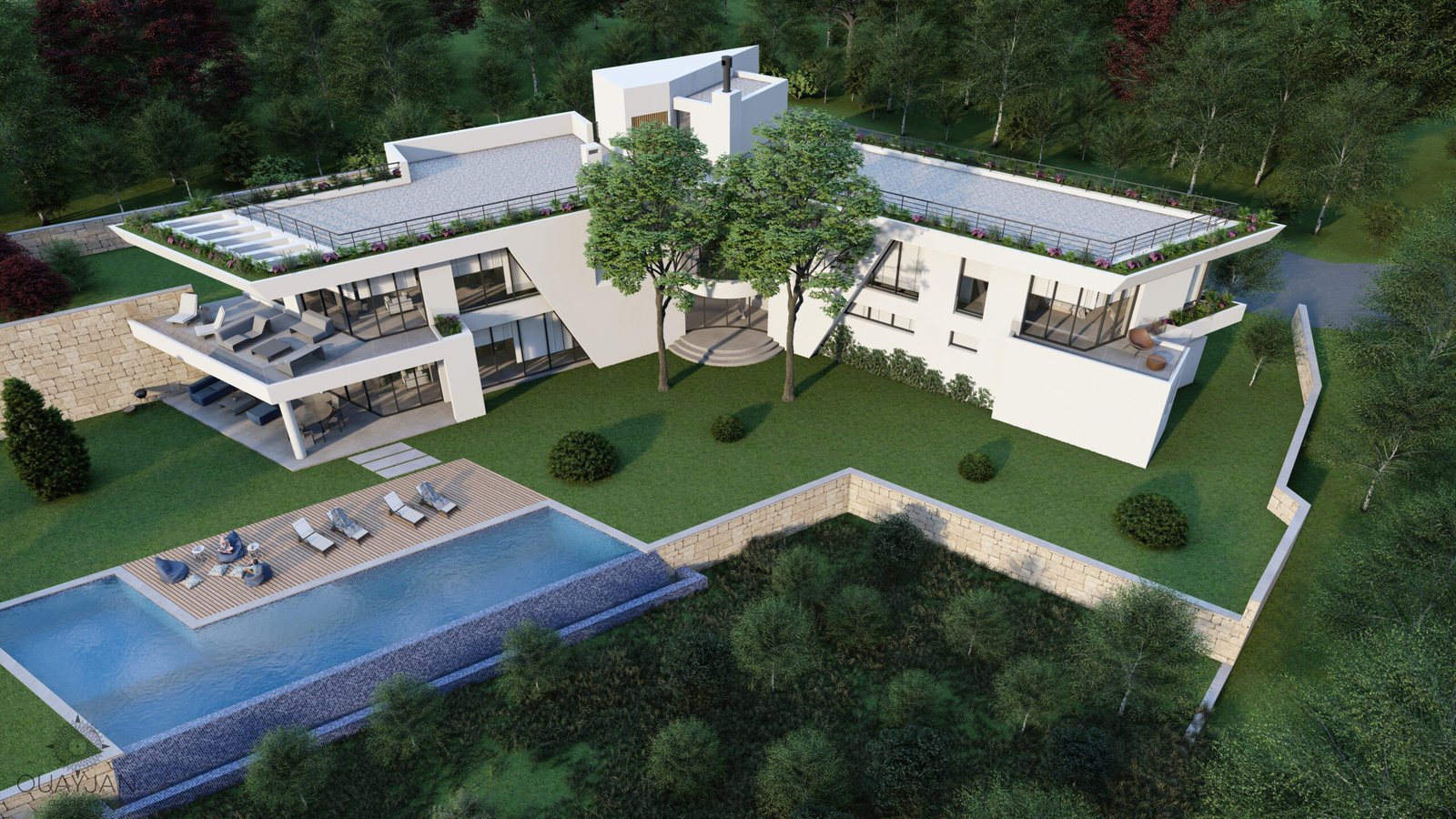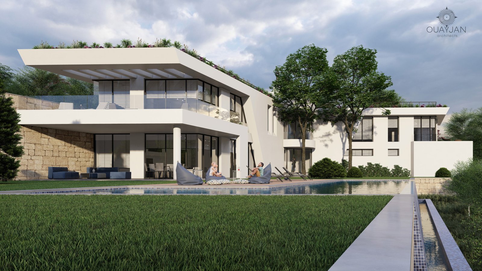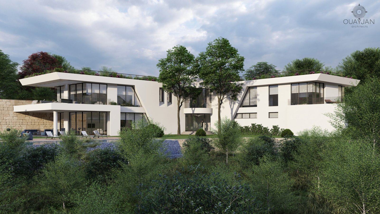 This L-shaped villa features a sleek white concrete facade with dynamic diagonal elements that enhance its modern appeal. A beautifully designed pool completes the exterior, offering a luxurious space for relaxation.