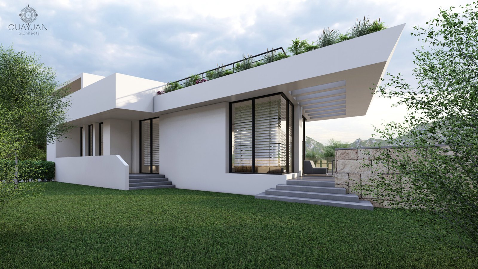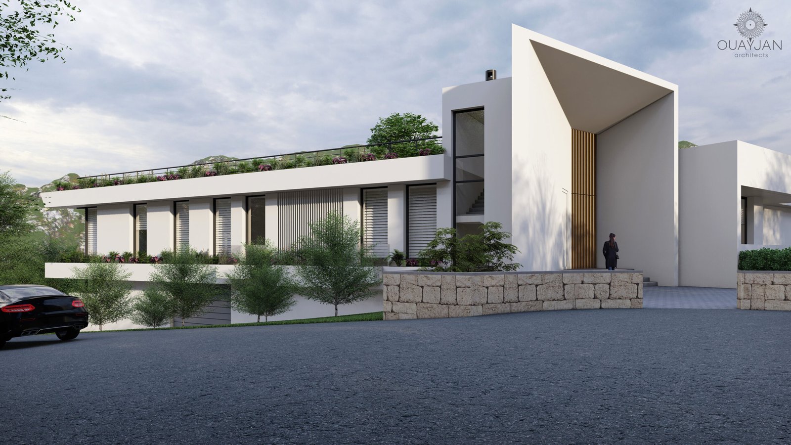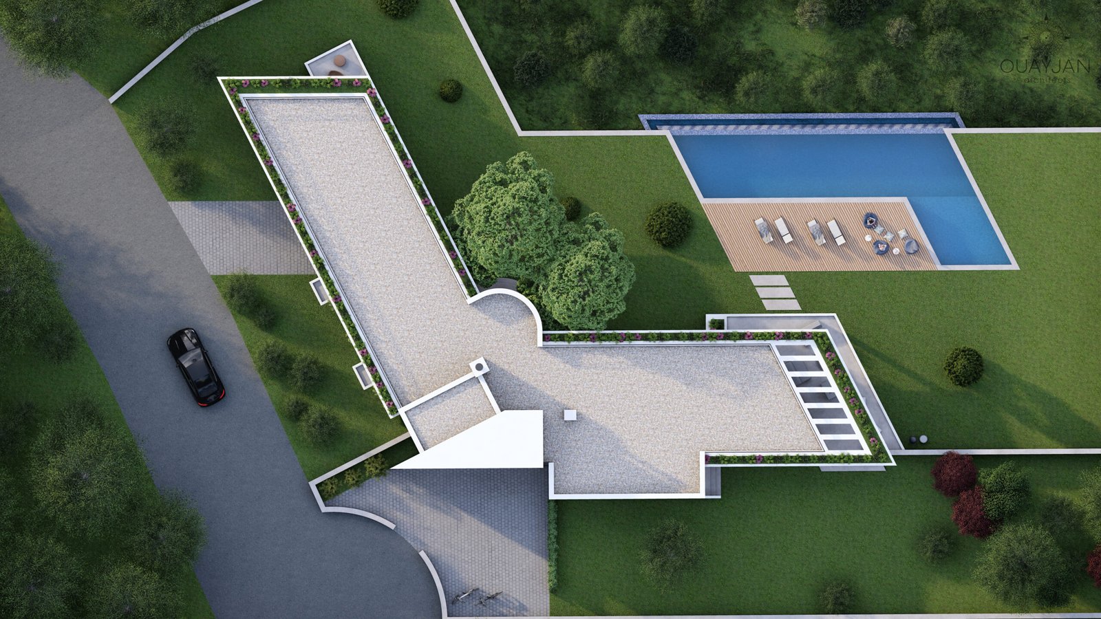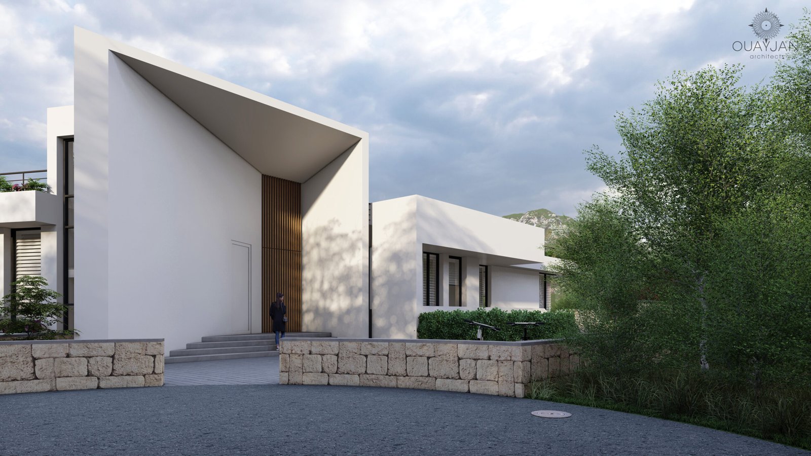 This L-shaped villa features a sleek white concrete facade with dynamic diagonal elements that enhance its modern appeal. A beautifully designed pool completes the exterior, offering a luxurious space for relaxation.