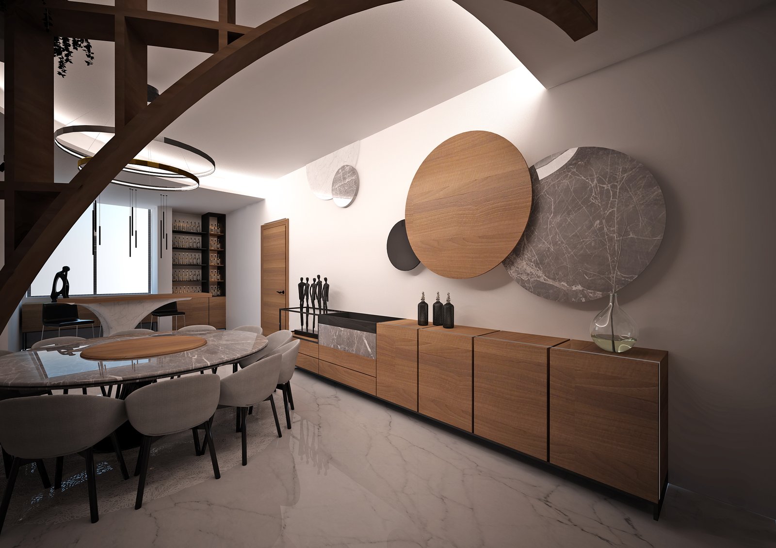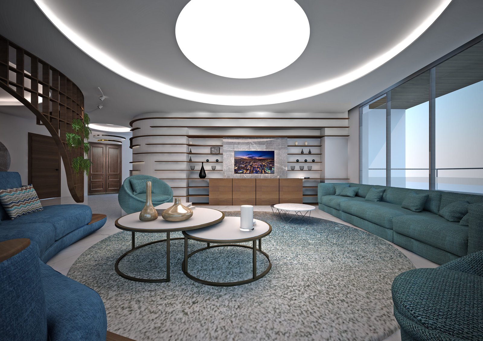 This design embraces fluidity and organic movement with wavy wooden shelving, rounded furniture in calming blue tones, and a serene, cohesive atmosphere. A circular ceiling light casts a warm glow, while floor-to-ceiling windows invite natural light, connecting indoors and outdoors. Every detail, from sleek coffee tables to wood accents, evokes harmony and effortless sophistication.