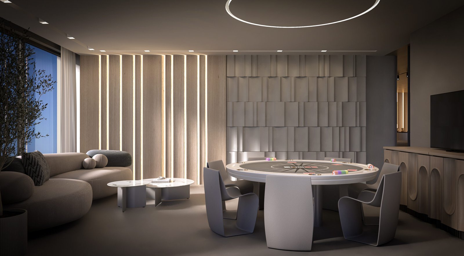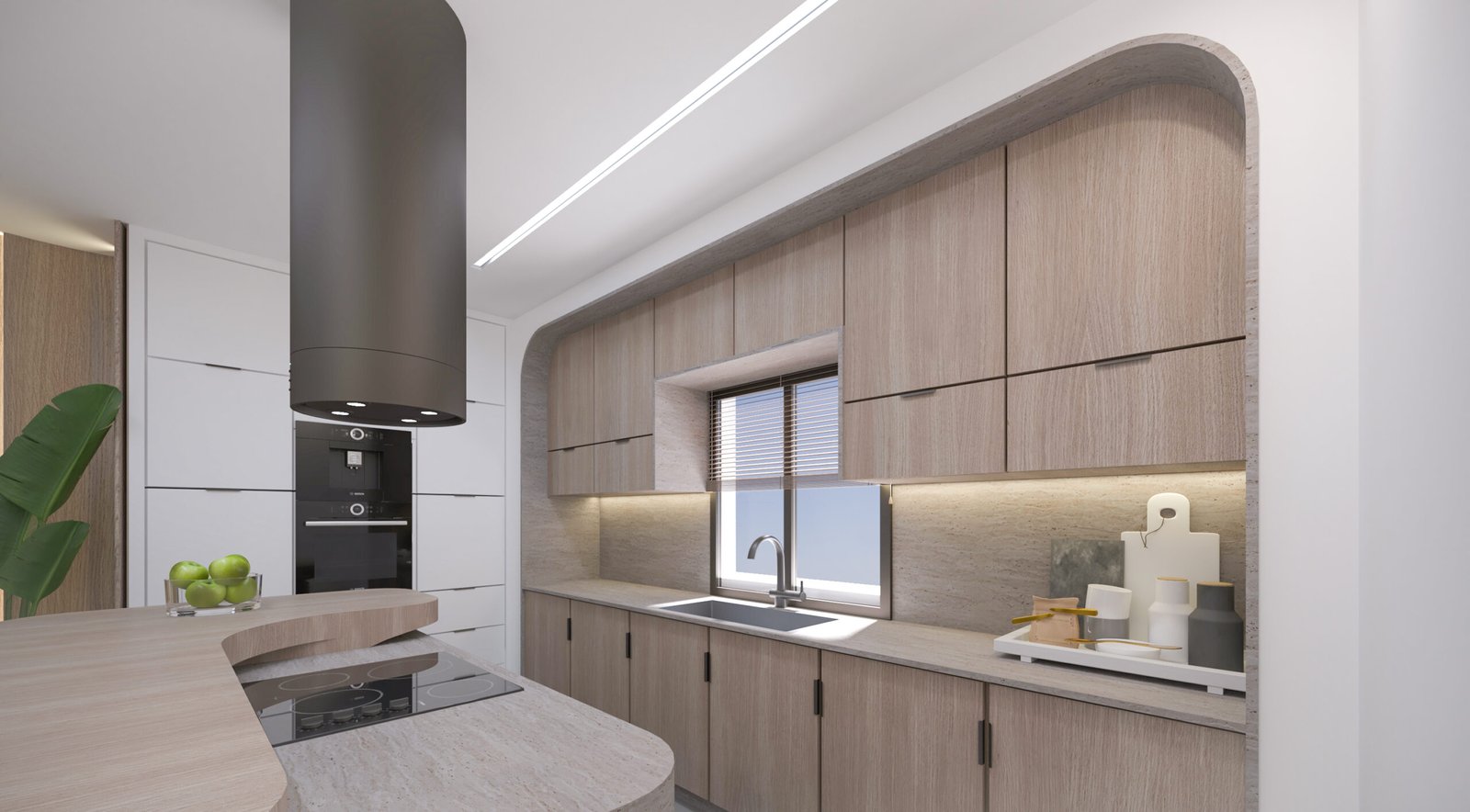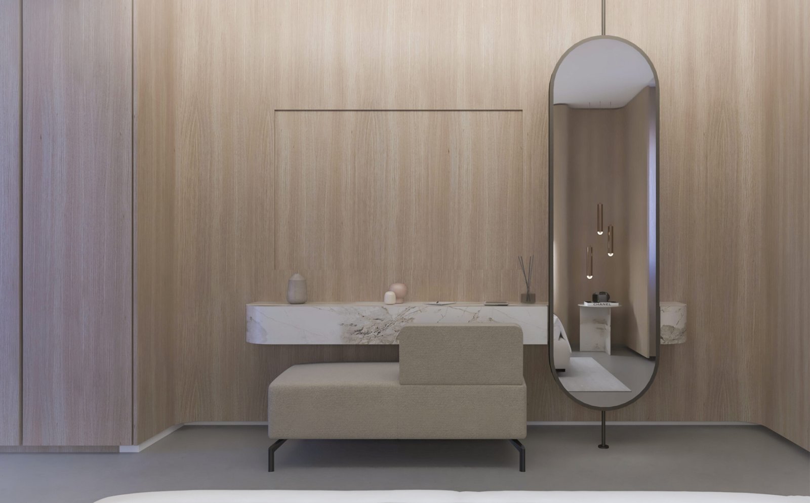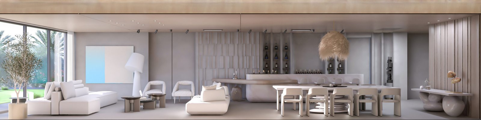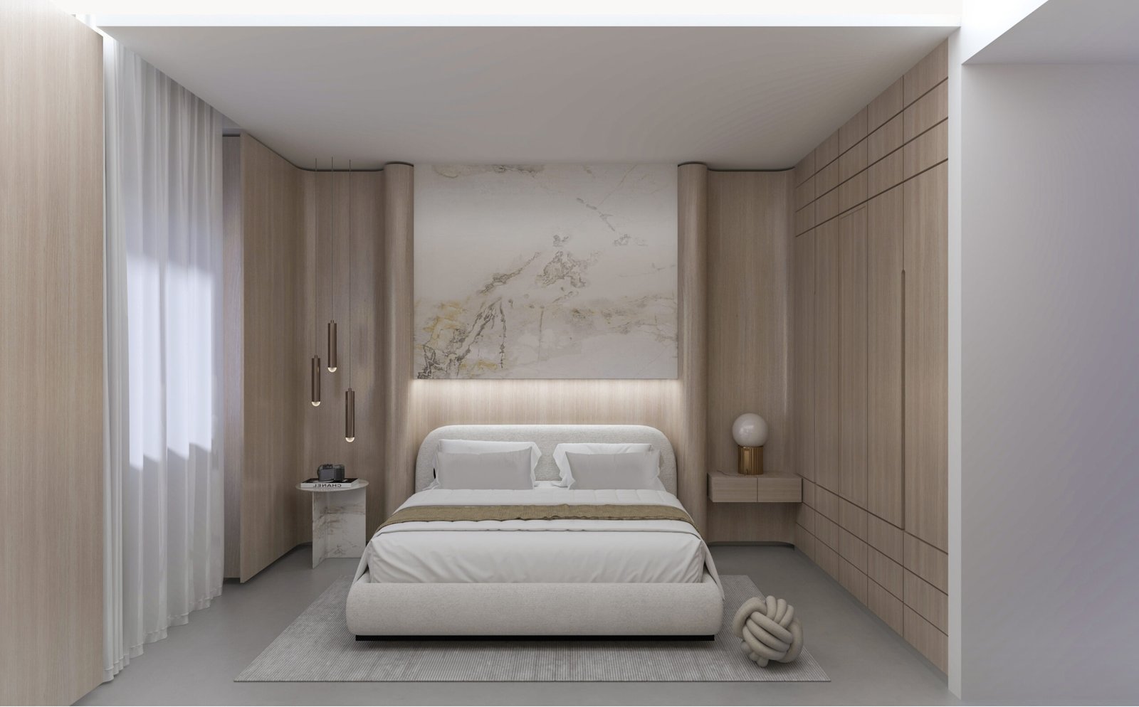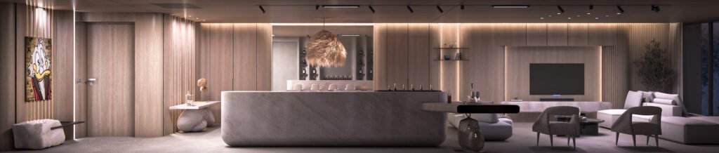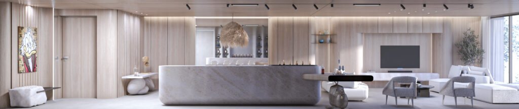 The chalet’s interior features a serene, yacht-inspired design blending white tones, light wood, and marble for an inviting, sophisticated ambiance. Curved lines evoke the elegance of a yacht, creating a warm, refined retreat.