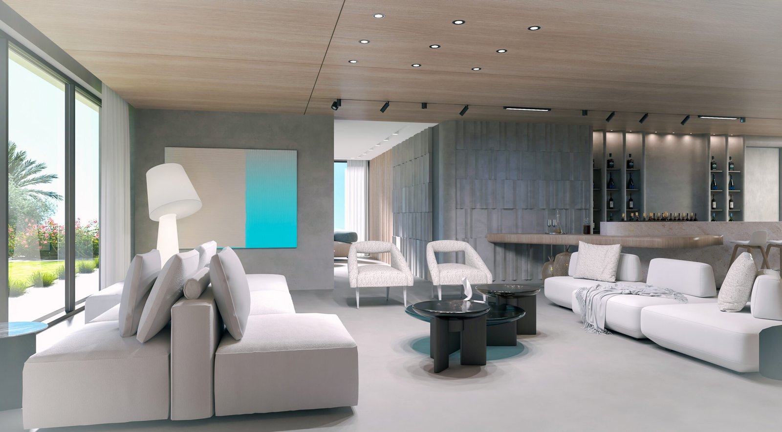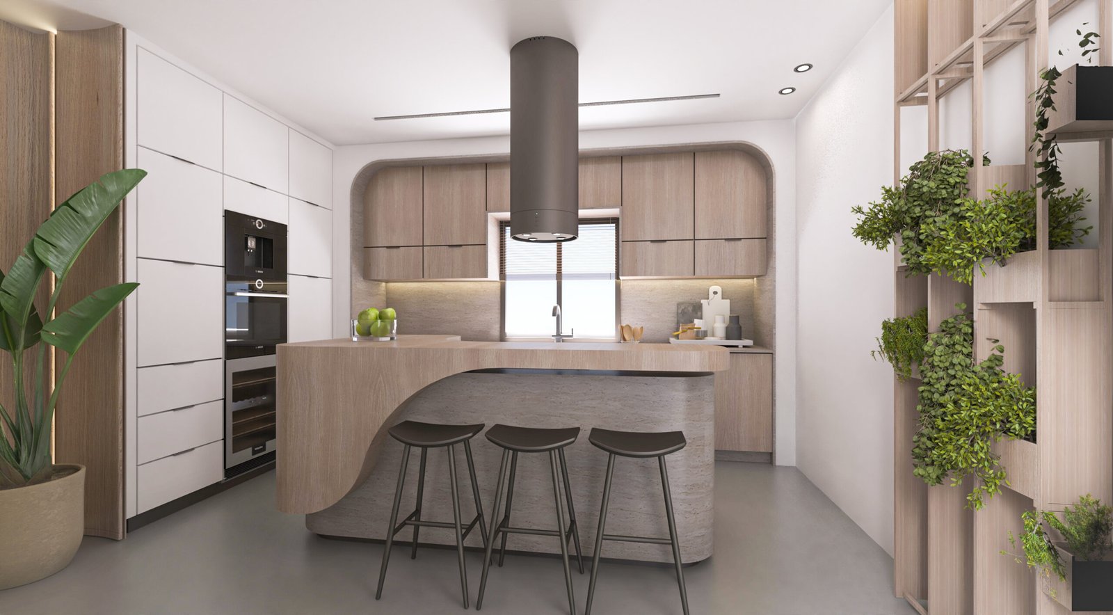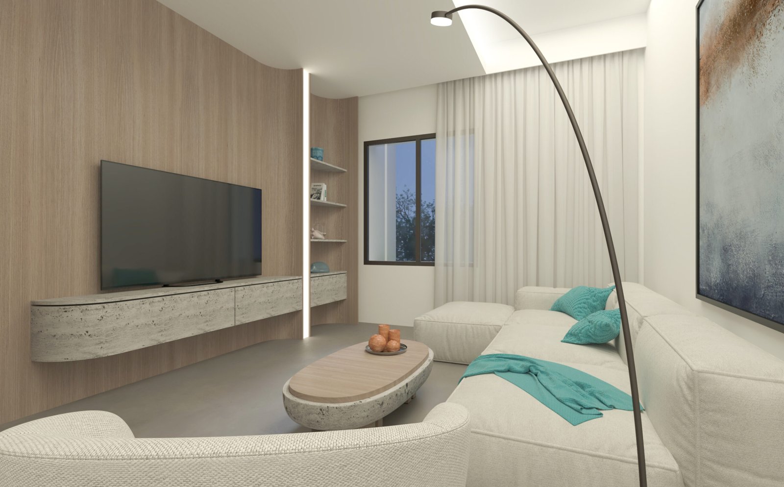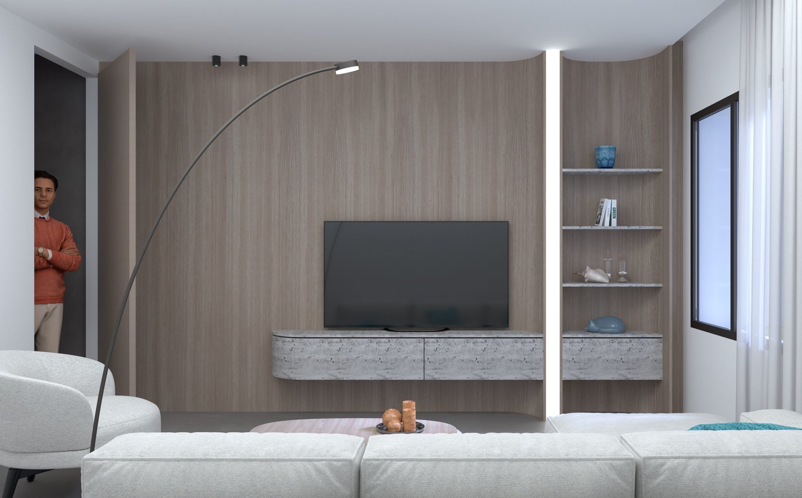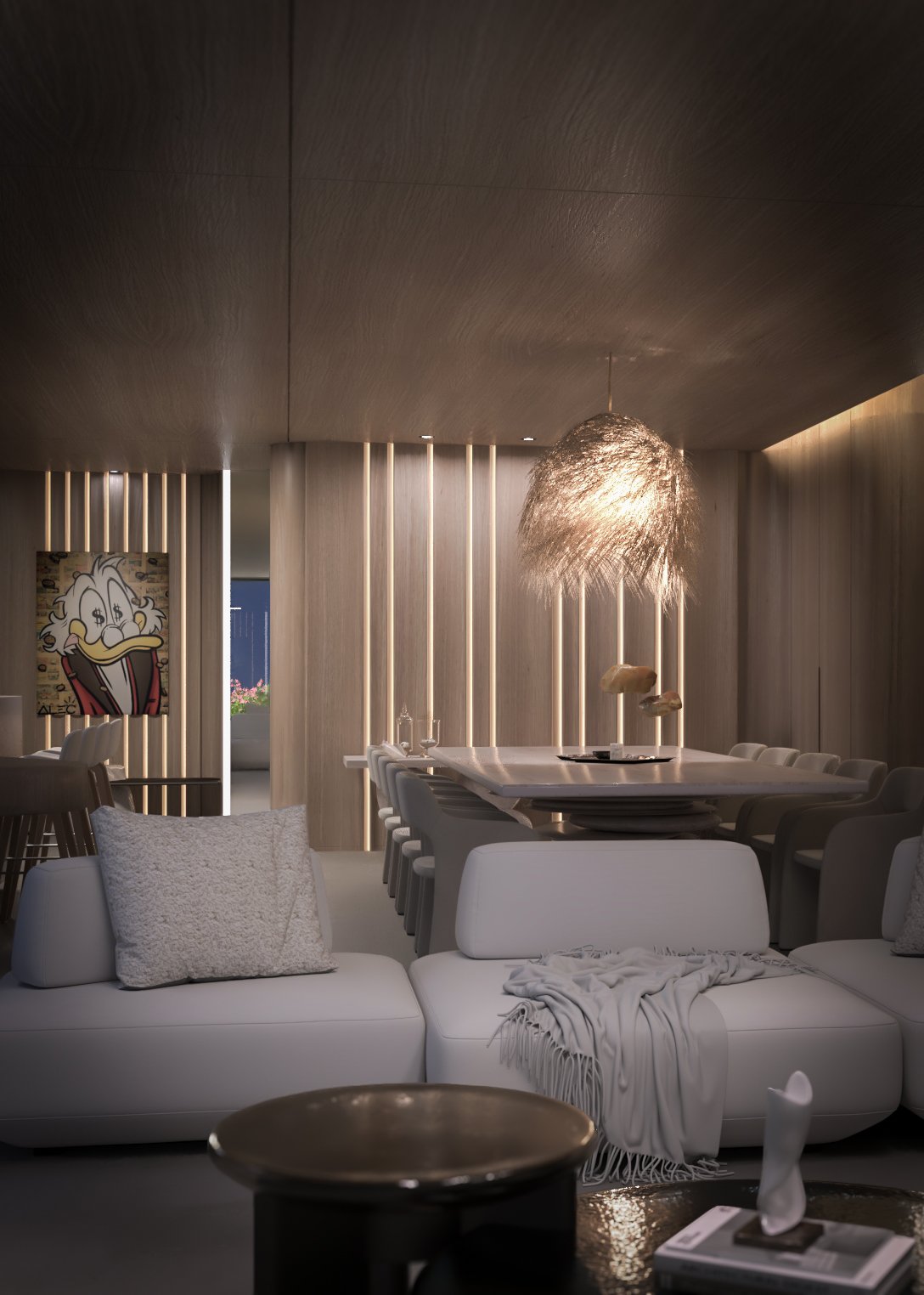 The chalet’s interior features a serene, yacht-inspired design blending white tones, light wood, and marble for an inviting, sophisticated ambiance. Curved lines evoke the elegance of a yacht, creating a warm, refined retreat.