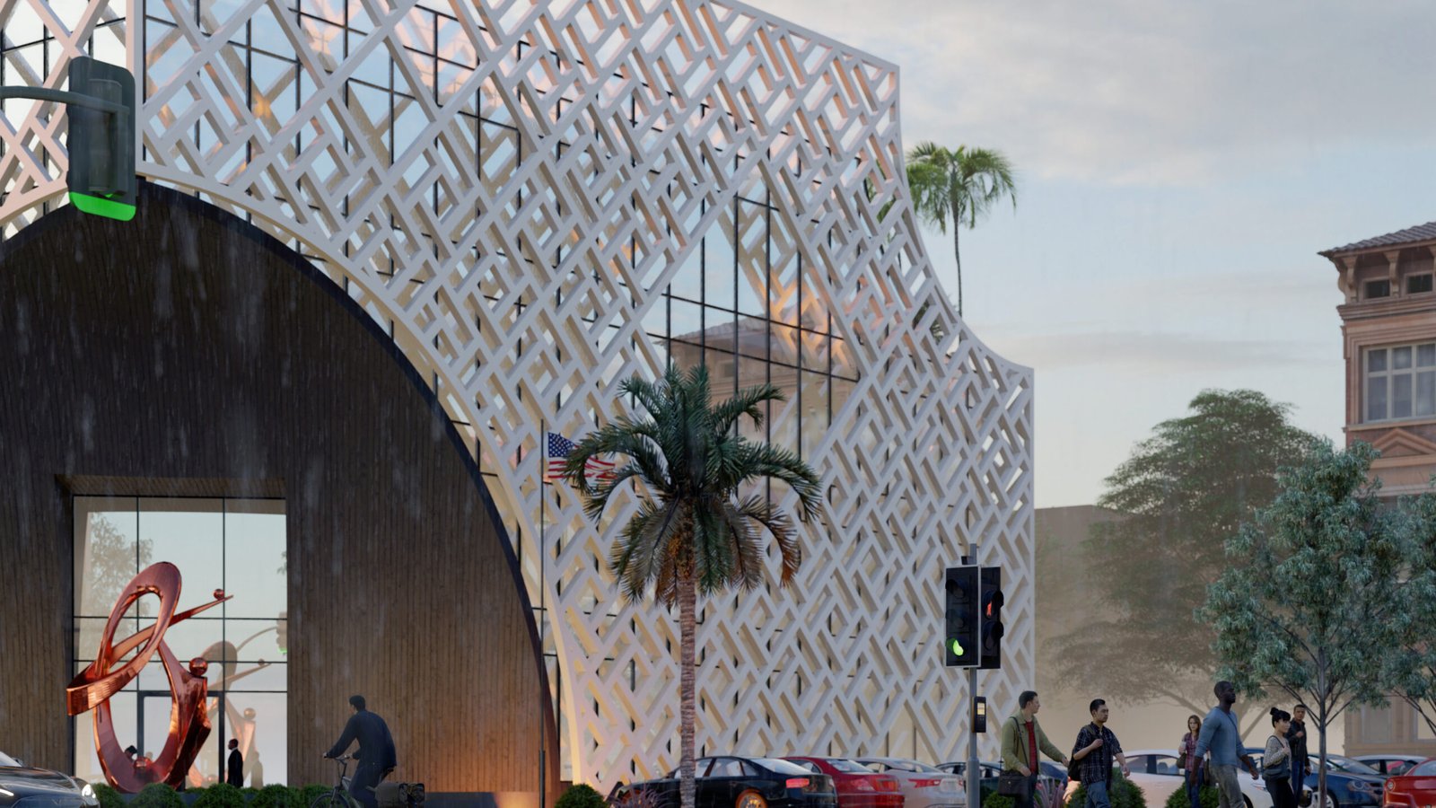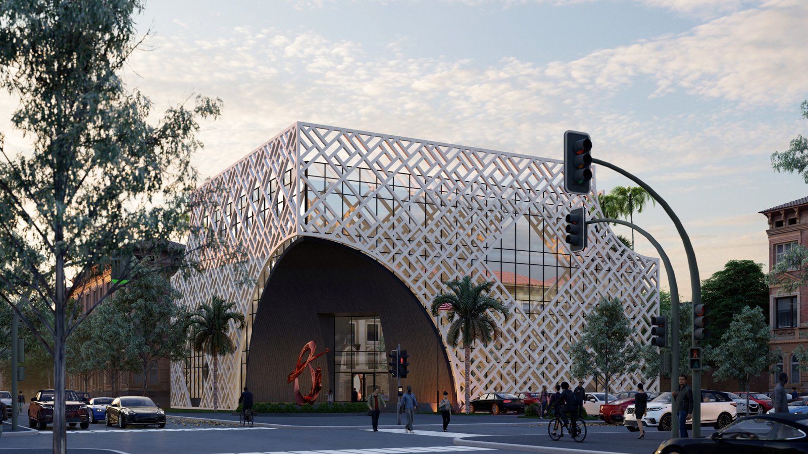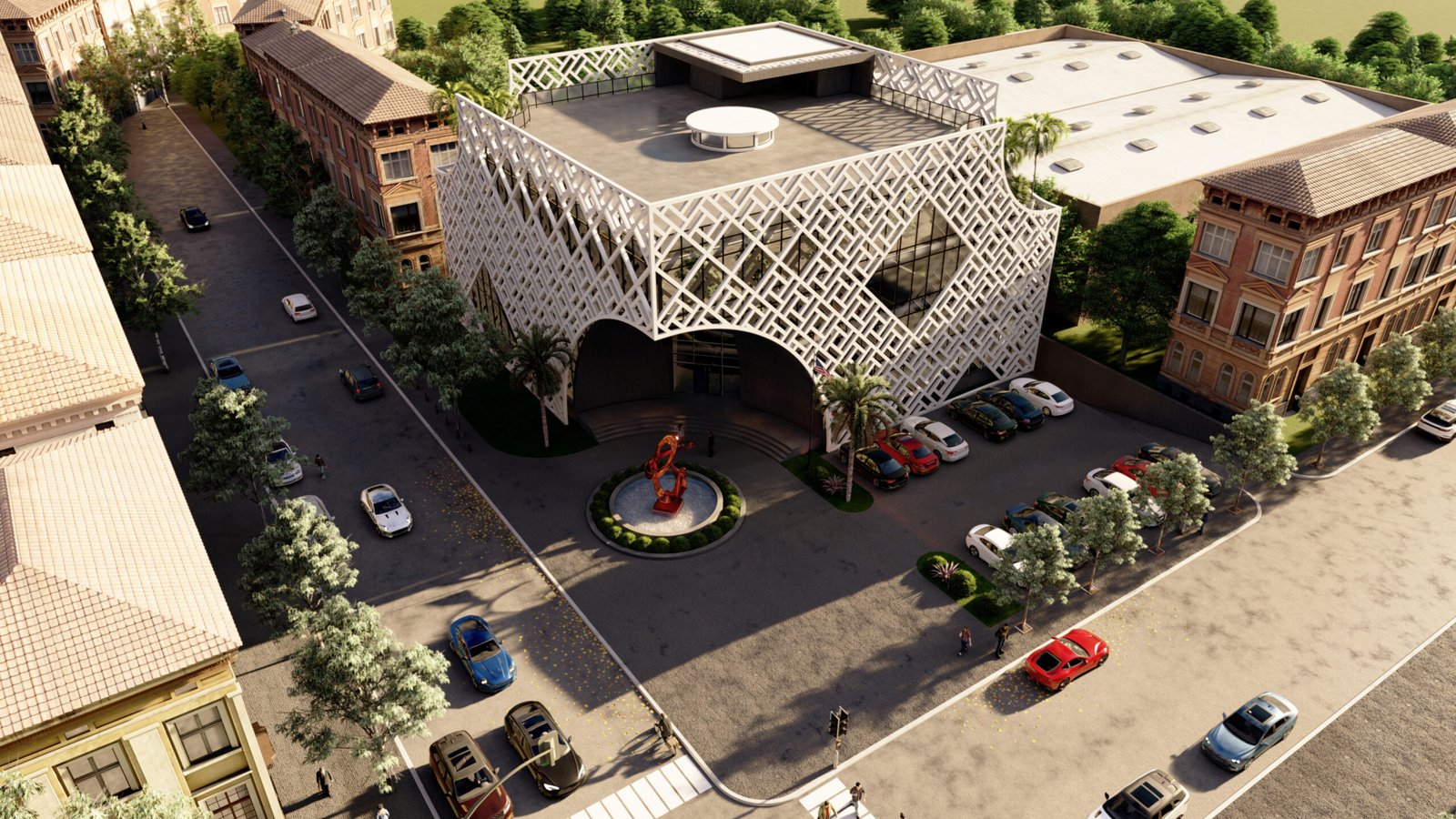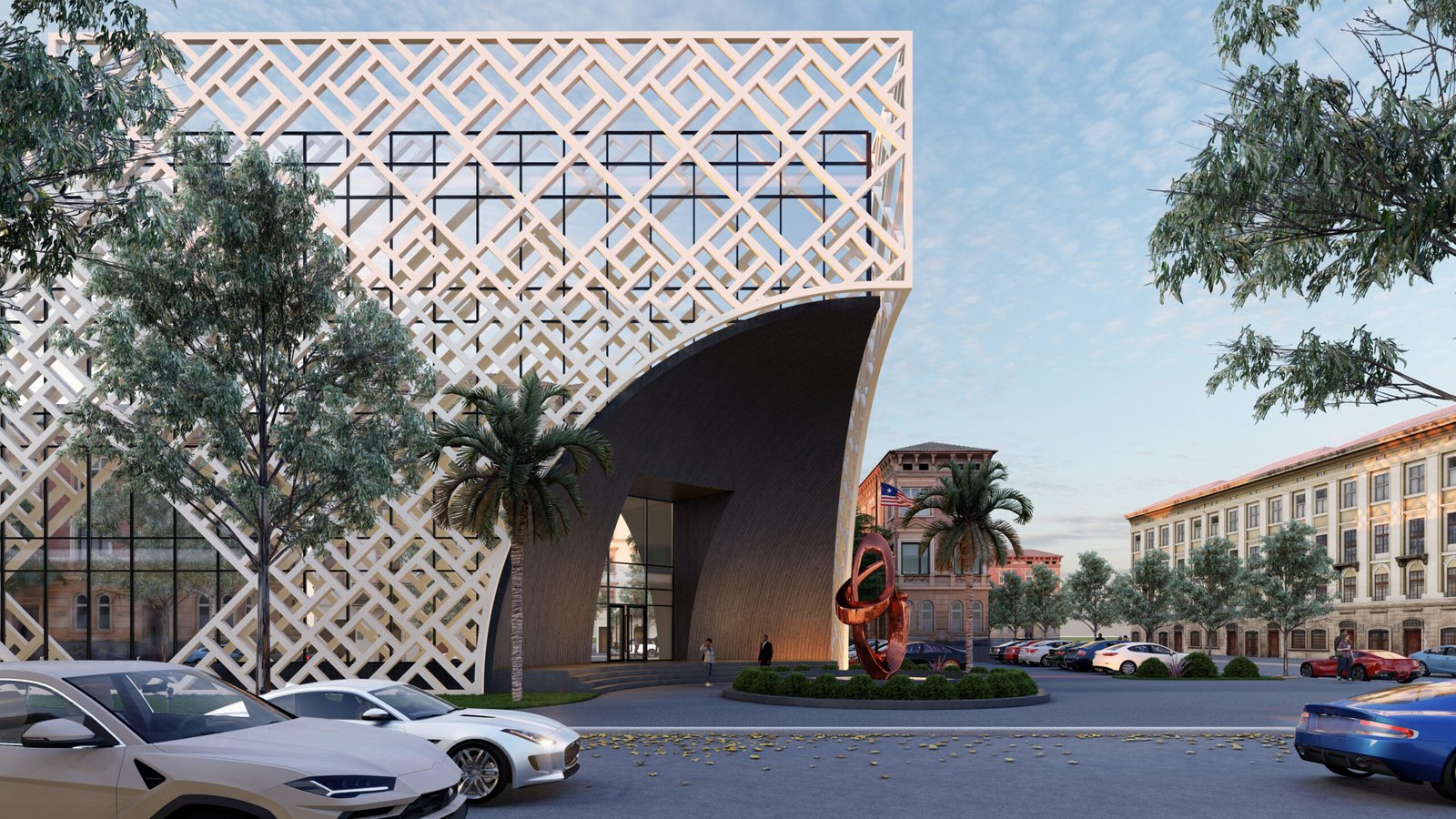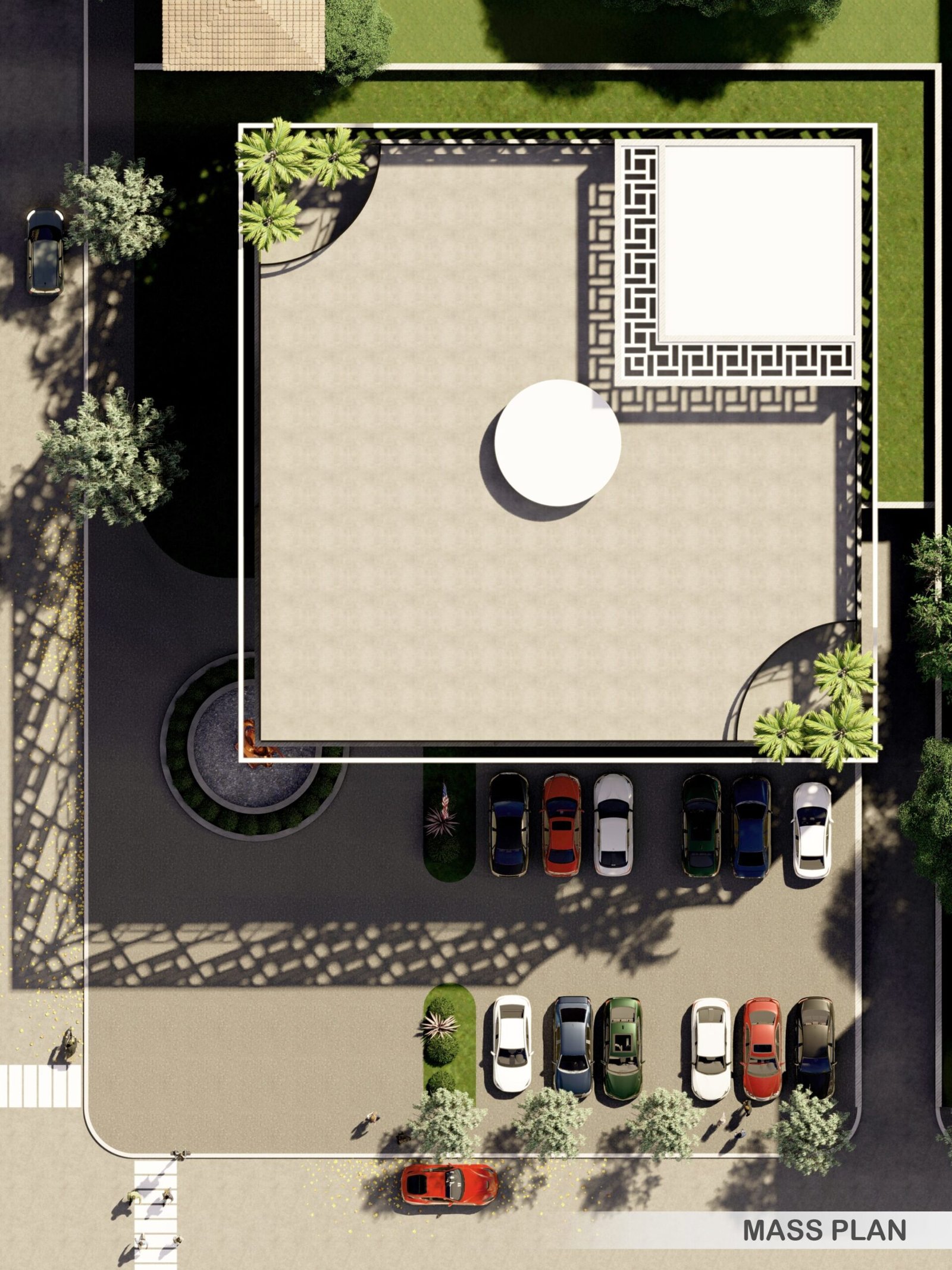 This project features a square, functional volume wrapped in a sleek metal mesh structure. Combining transparency and sustainability, the mesh provides shade, reduces heat gain, and allows natural light to filter through. This practical yet bold design enhances energy efficiency while creating a striking modern aesthetic.