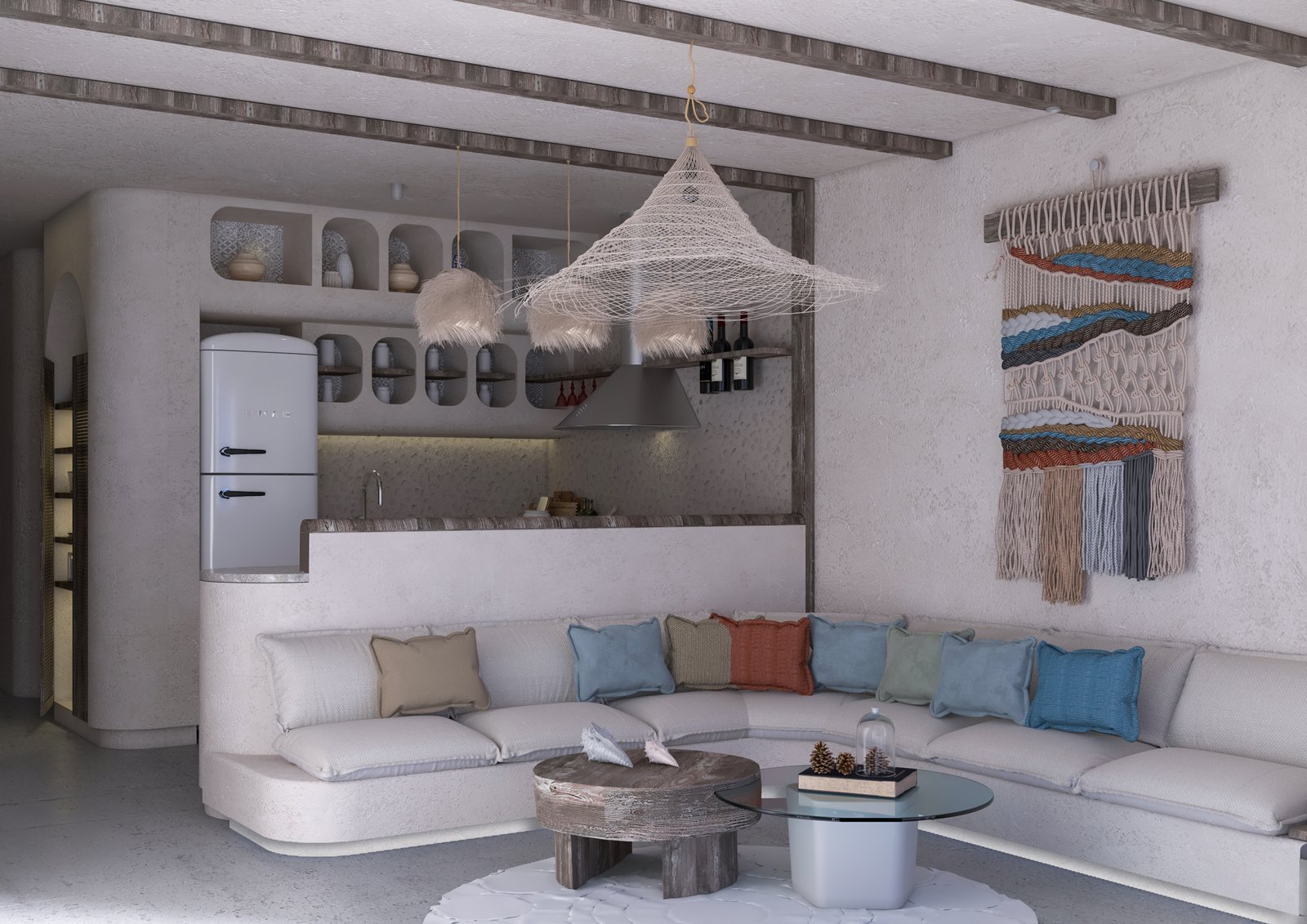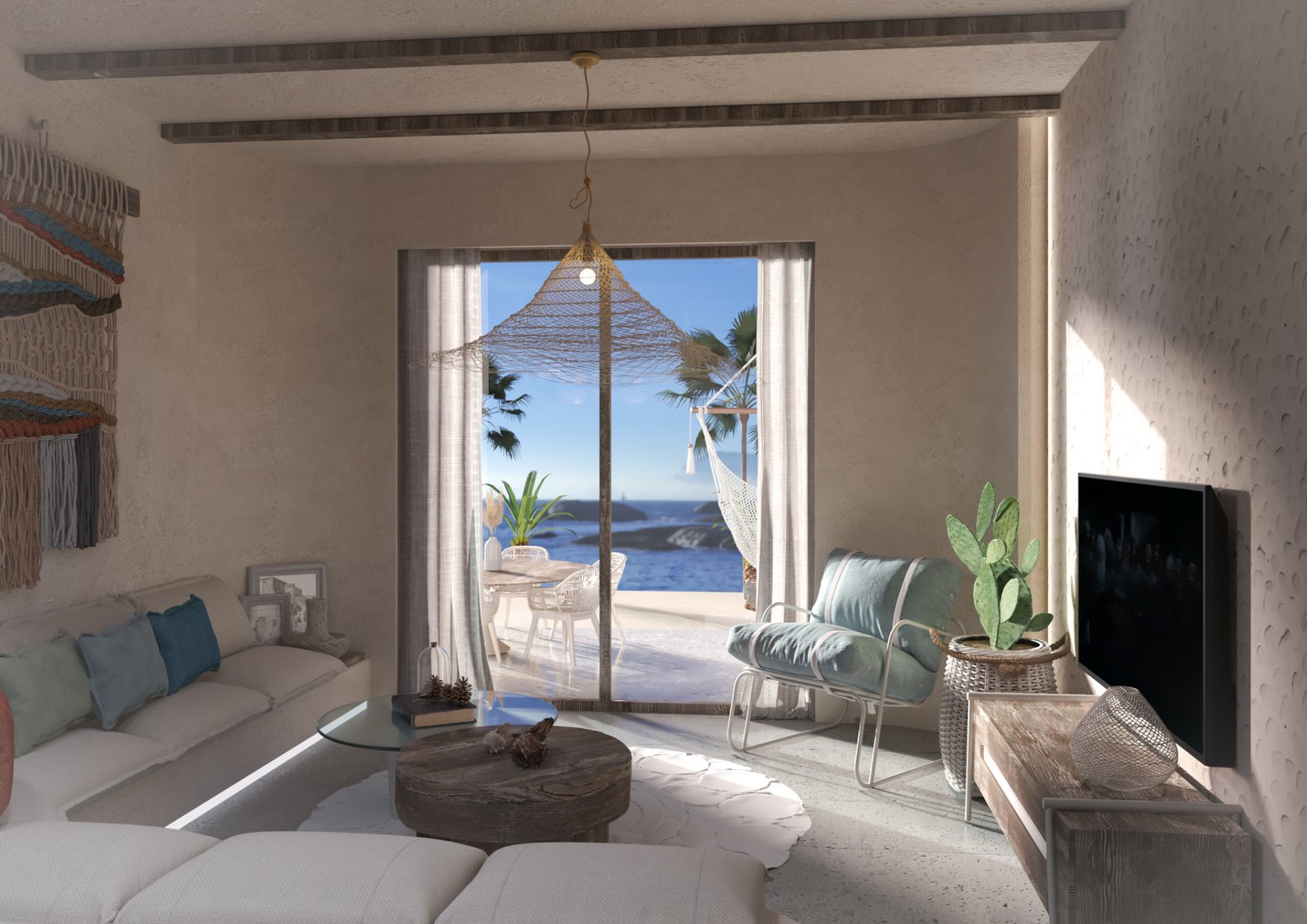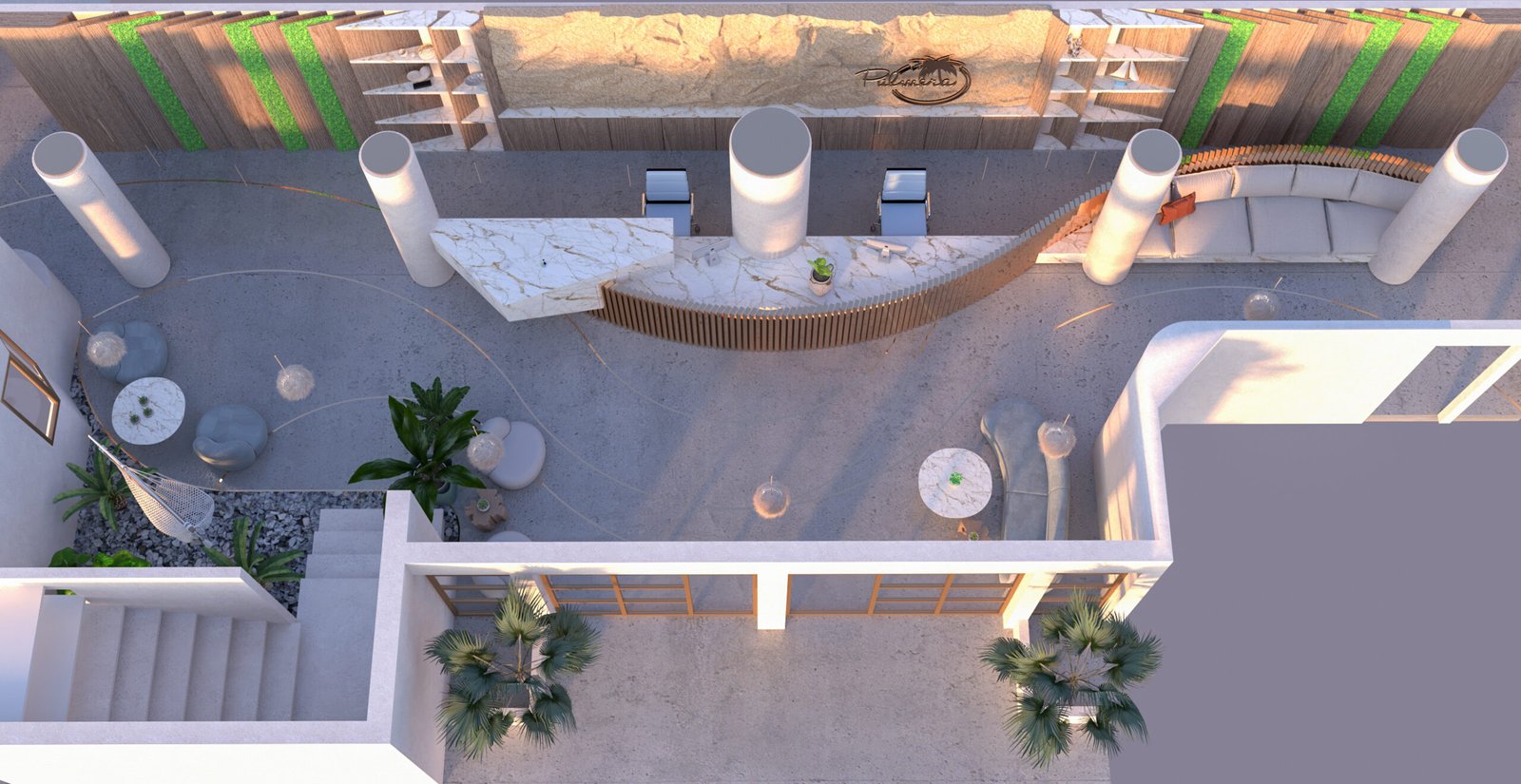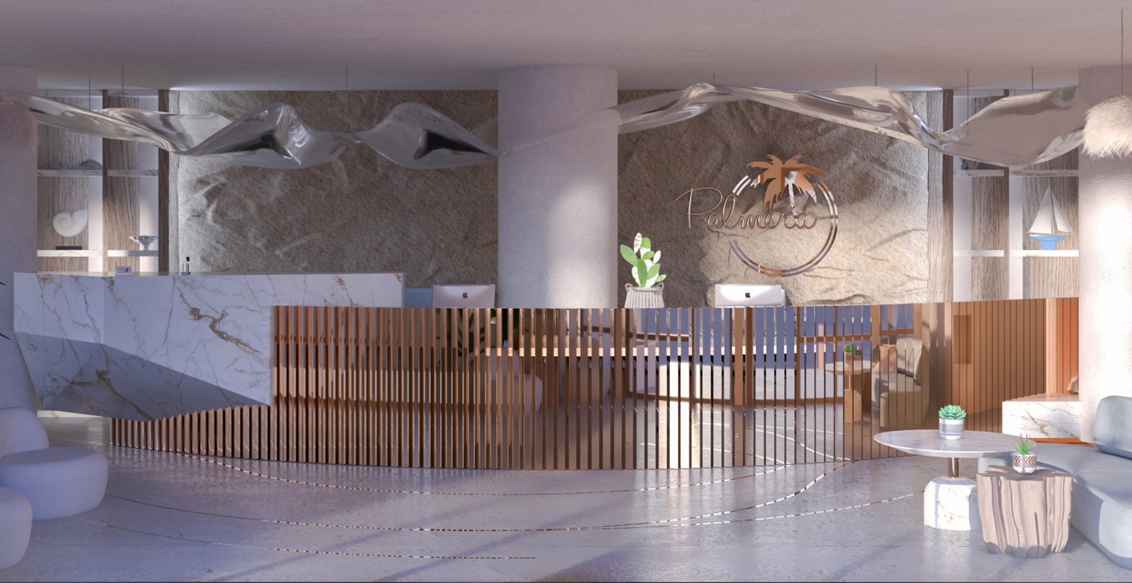 The chalet’s entrance welcomes guests with earthy tones, exuding comfort and tranquility. A sculpted light design adds artistry, while a sleek bronze reception desk enhances elegance. This blend of natural hues and refined details sets a serene tone for the interiors.