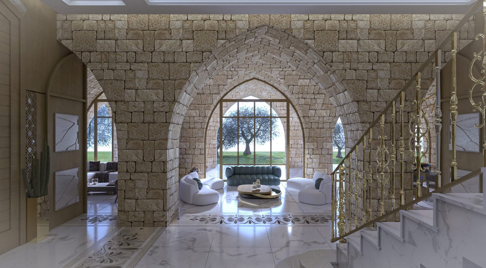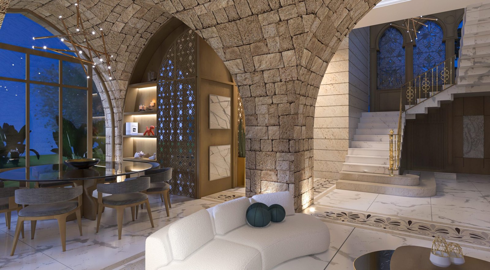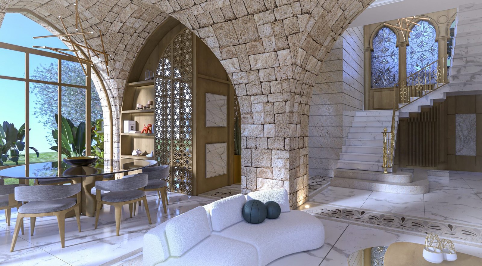 This luxurious interior blends classic Lebanese architecture with modern elegance, featuring grand stone arches, intricate mashrabiya panels, and expansive windows. Marble flooring, gold accents, and refined furnishings create a sophisticated yet inviting ambiance. Warm natural textures, contemporary pieces, and artistic lighting balance heritage with modern aesthetics for a timeless living experience.