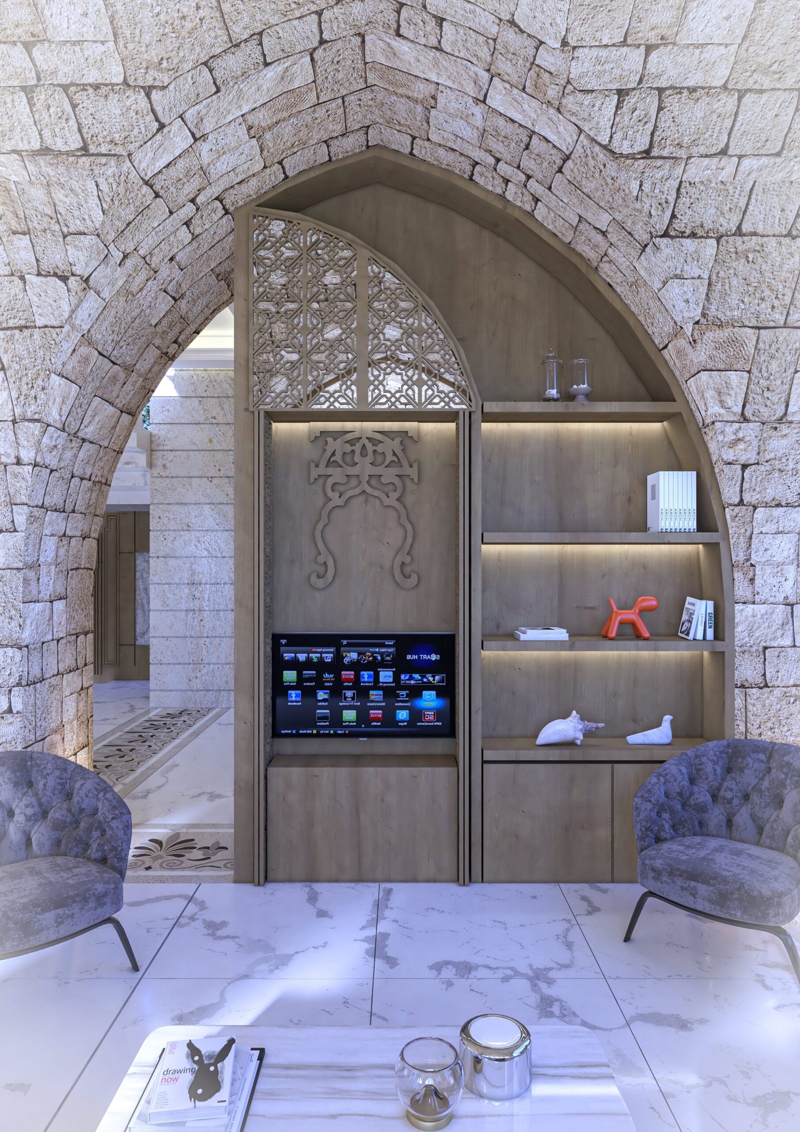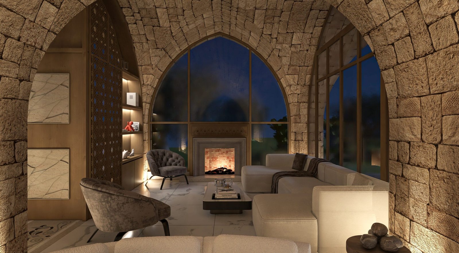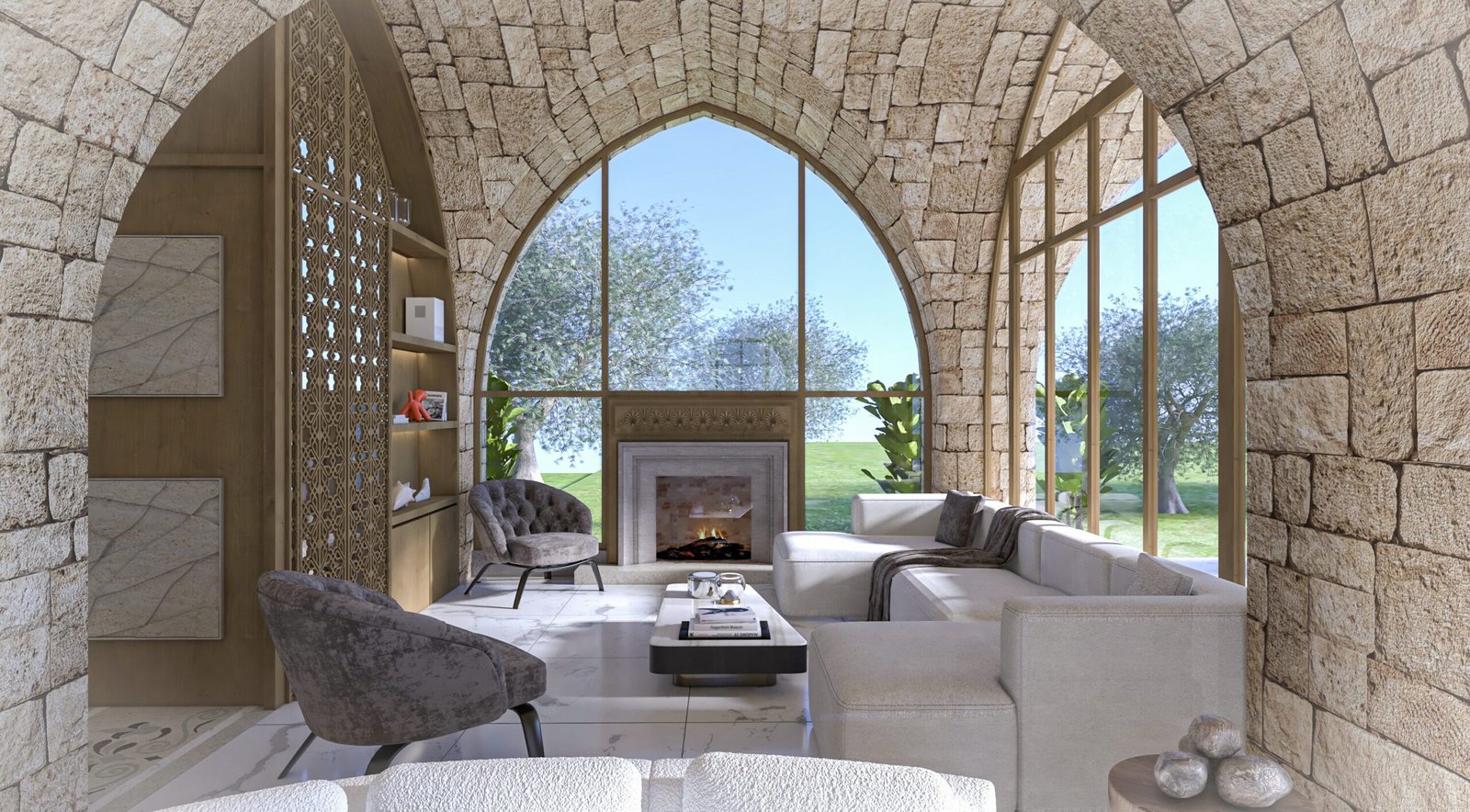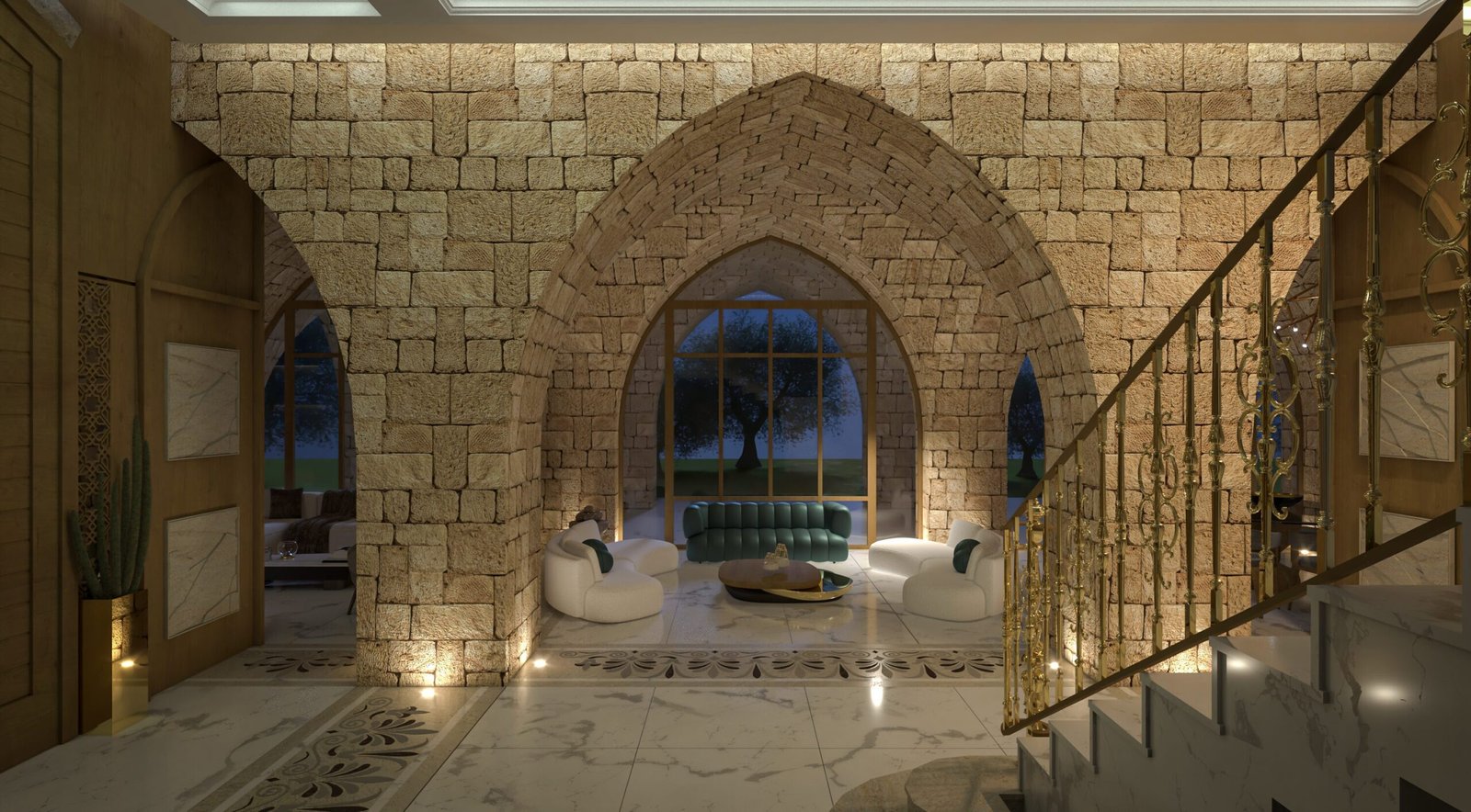 This luxurious interior blends classic Lebanese architecture with modern elegance, featuring grand stone arches, intricate mashrabiya panels, and expansive windows. Marble flooring, gold accents, and refined furnishings create a sophisticated yet inviting ambiance. Warm natural textures, contemporary pieces, and artistic lighting balance heritage with modern aesthetics for a timeless living experience.