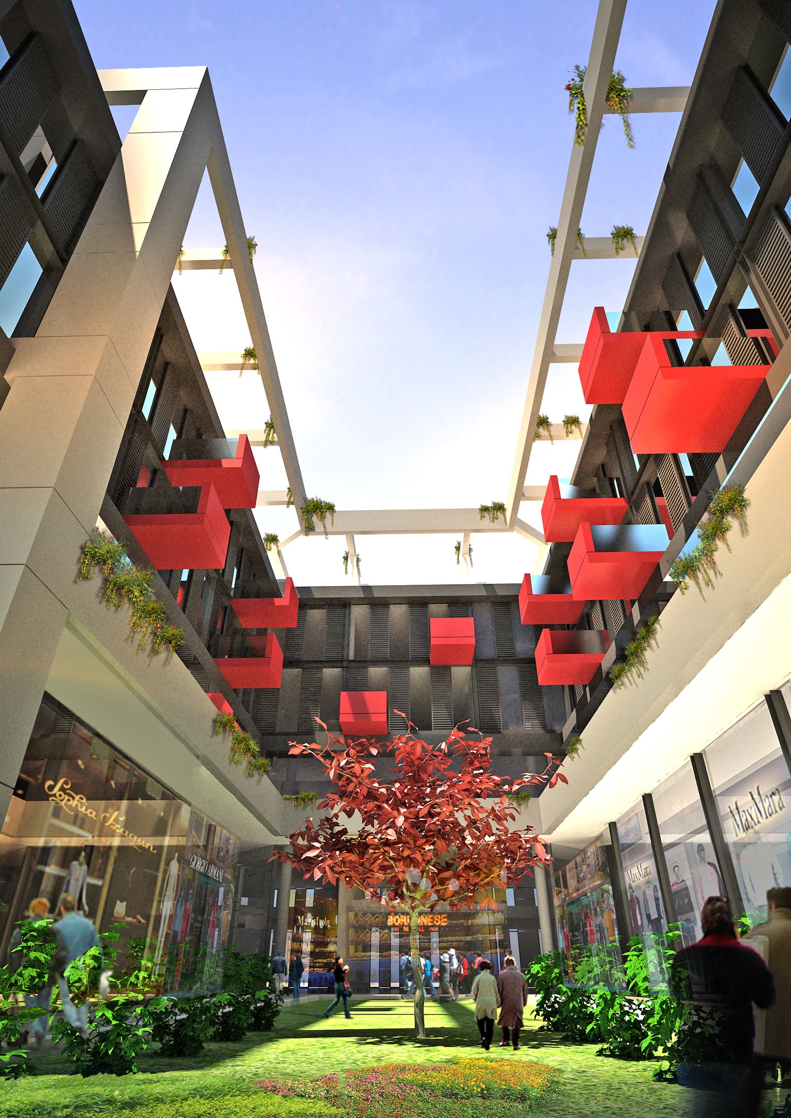 This mixed-use center features a sleek modern design with clean lines, open spaces, and large glass panels for connectivity. Bold red accents add striking contrast, highlighting key elements. Combining retail, office, and leisure spaces, it creates a vibrant hub for commerce and social interaction.
