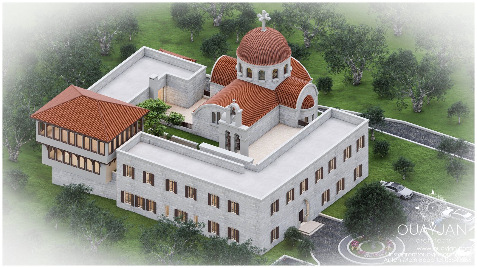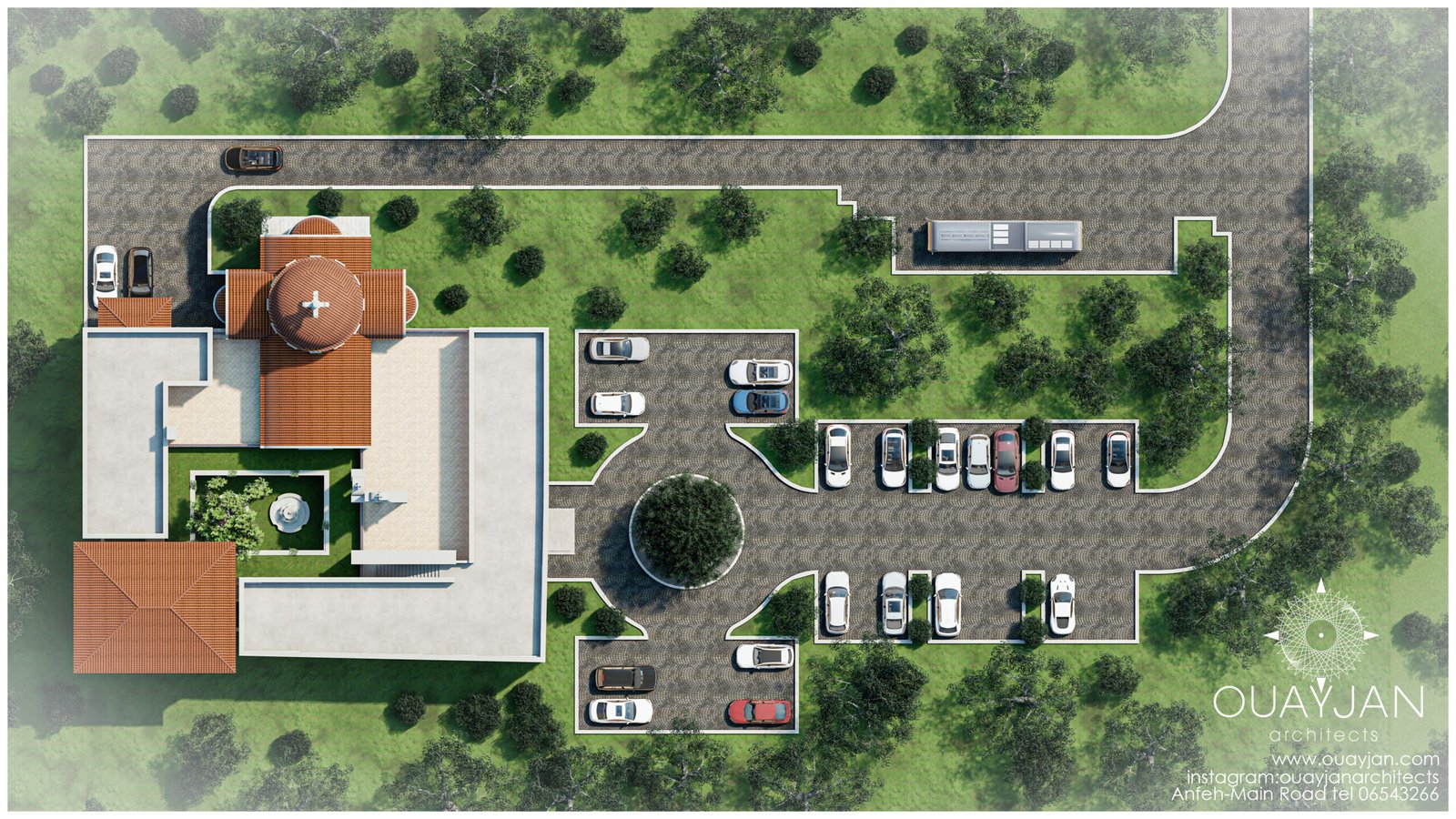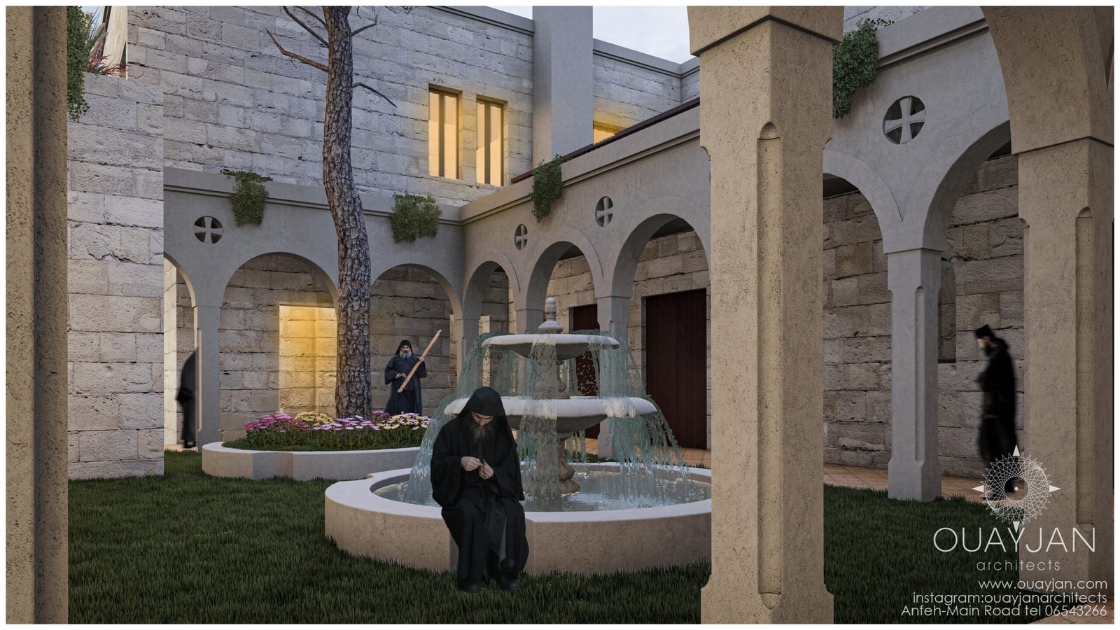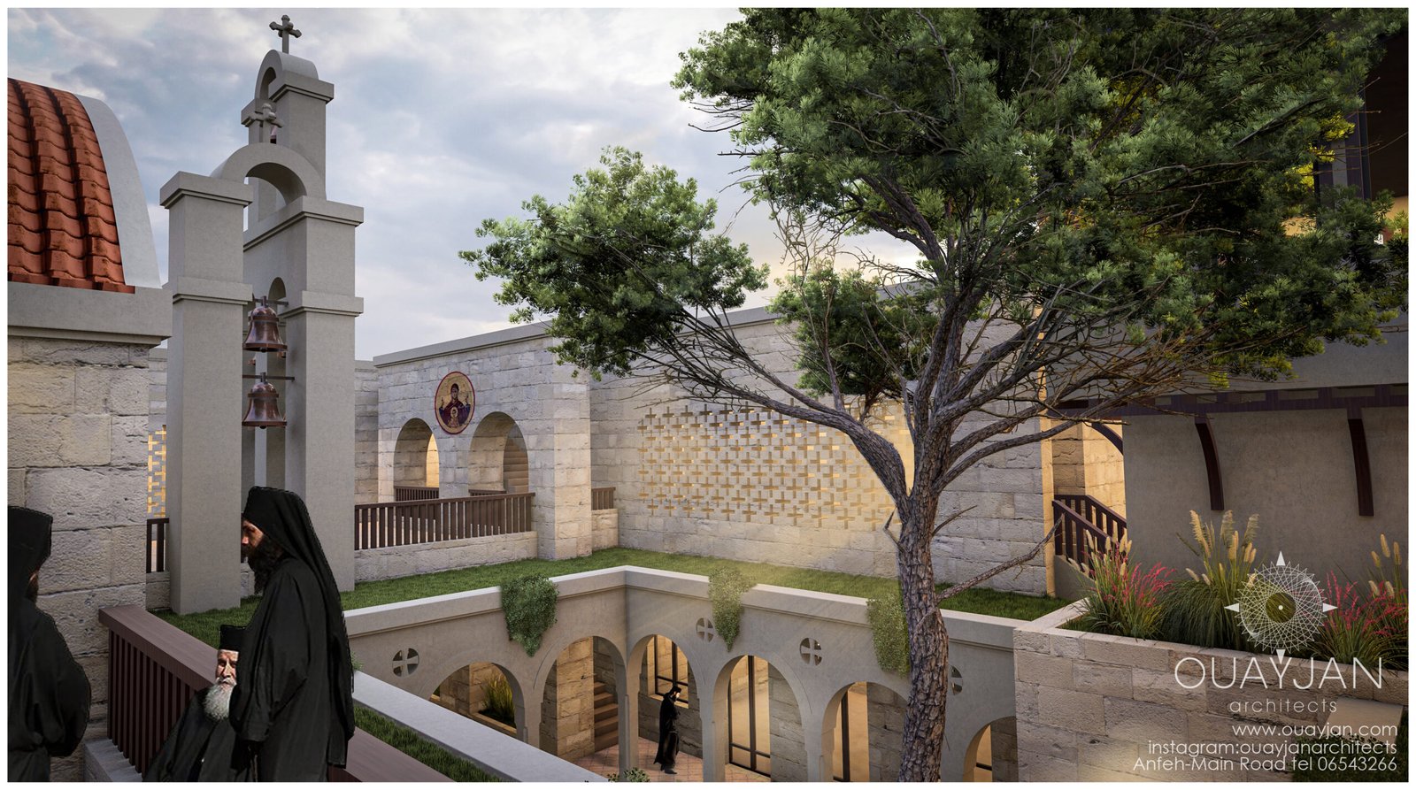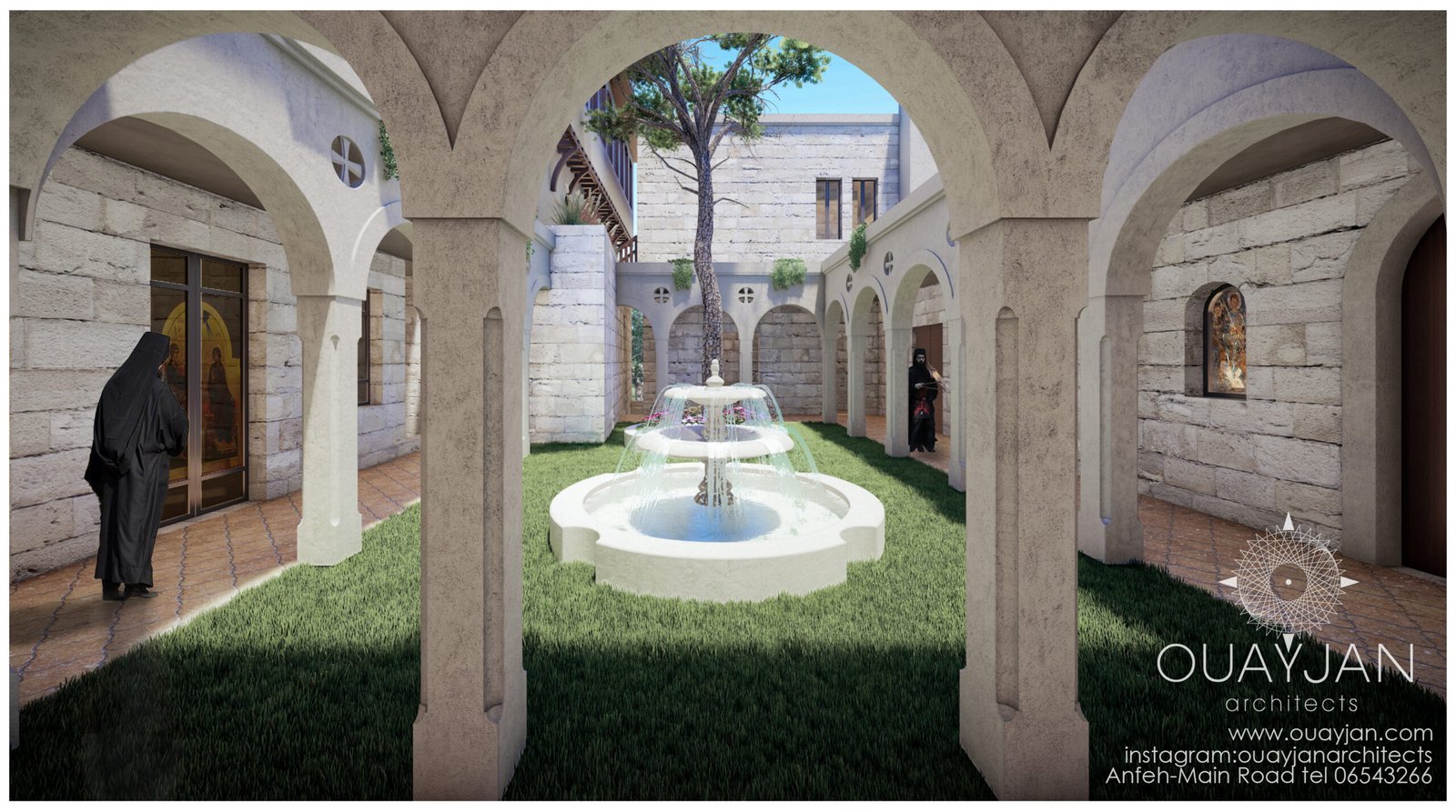 A landscaped courtyard, encircled by shaded portico hallways, provides a serene space for reflection and community.